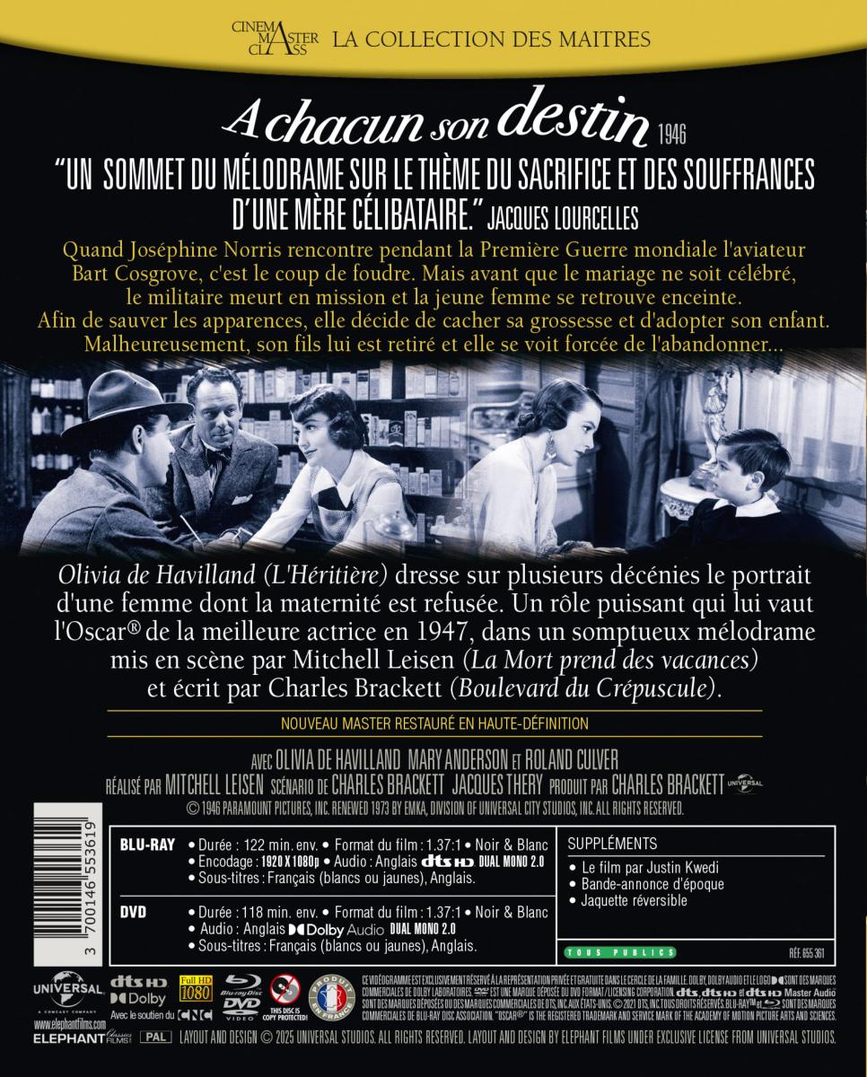 Titre : À chacun son destin - Combo Blu-ray + DVD Titre original : To Each His Own Date de sortie : 24/03/2026 Réalisateur(s) : Mitchell Leisen Acteurs : Olivia de Havilland, Mary Anderson, Roland Culver, Phillip Terry, Bill Goodwin, Virginia Welles, Victoria Horne, Griff Barnett Scénariste(s) : Charles Brackett, Jacques Théry, Dodie Smith Musique : Victor Young Résumé : Quand Joséphine Norris rencontre pendant la Première Guerre mondiale l'aviateur Bart Cosgrove, c'est le coup de foudre. Mais avant que le mariage ne soit célébré, le militaire meurt en mission et la jeune femme se retrouve einceinte. Afin de sauver les apparences, elle décide de cacher sa grossesse et d'adopter son enfant. Malheureusement, son fils lui est retiré et elle se voit forcée de l'abandonner... Accroche : "Un sommet du mélodrame sur le thème du sacrifice et des souffrances d’une mère célibataire."