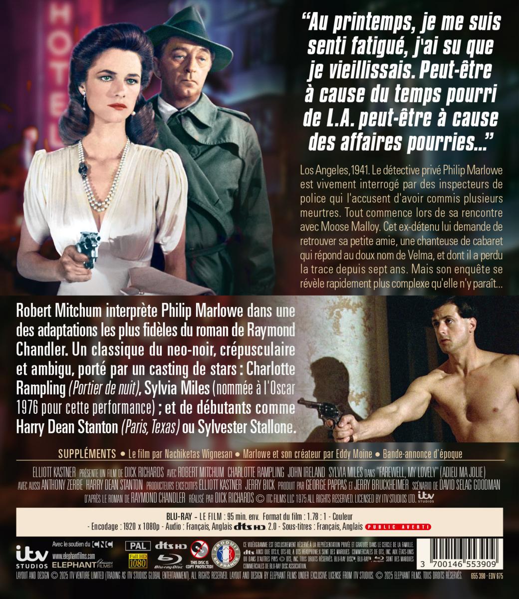Titre : Adieu ma jolie - Blu-ray single Titre original : Farewell, My Lovely Réalisateur(s) : Dick Richards Acteurs : Robert Mitchum, Charlotte Rampling, John Ireland, Sylvia Miles, Anthony Zerbe, Harry Dean Stanton, Sylvester Stallone Scénariste(s) : Raymond Chandler, David Zelag Goodman Musique : David Shire Résumé : Los Angeles, 1941. Le détective privé Philip Marlowe est vivement interrogé par des inspecteurs de police qui l'accusent d'avoir commis plusieurs meurtres. Tout commence lors de sa rencontre avec Moose Malloy. Cet ex-détenu lui demande de retrouver sa petite amie, une chanteuse de cabaret qui répond au doux nom de Velma, et dont il a perdu la trace depuis sept ans. Mais son enquête se révèle rapidement plus complexe qu'elle n'y paraît... Accroche : "Au printemps, je me suis senti fatigué, j'ai su que je vieillissais. Peut-être à cause du temps pourri de L.A. Peut-être à causes des affaires pourries..." Robert Mitchum interprète Philip Marlowe dans une des adaptations les plus fidèles du roman de Raymond Chandler. Un classique du neo-noir, crépusculaire et ambigu, porté par un casting de stars : Charlotte Rampling (Portier de nuit), Sylvia Miles (nommée à l'Oscar 1976 pour cette performance) ; et de débutants comme Harry Dean Stanton (Paris, Texas) ou Sylvester Stallone. Pays de production : États-Unis Année de production : 1975 Durée : 95 min. env. Format audio : Français, Anglais - DTS HD 2.0 Classification : Public averti Copyright : © ITC Films LLC 1975 All Rights Reserved. Licensed by ITV Studios Ltd.