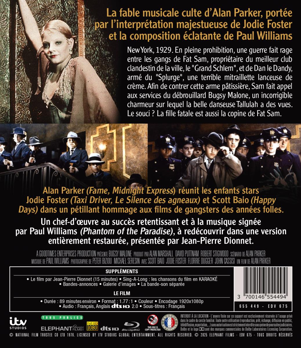 Titre : Bugsy Malone - Blu-ray single Titre original : Bugsy Malone Réalisateur(s) : Alan Parker Acteurs : Jodie Foster, Scott Baio, John Cassisi, Martin Lev Scénariste(s) : Alan Parker Musique : Paul Williams Résumé : Dans le New York des années 20, Fat Sam règne en maître sur le cabaret "Le Grand Schlem" jusqu'au jour où Dan Le Dandy et son gang débarquent armés du "Splurge Gun", mitraillette lanceuse de crème. Fat Sam, Tallulah et Bugsy Malone arriveront-ils à renverser Dans Le Dandy ? Accroche : La fable musicale culte d’Alan Parker, portée par l’interprétation majestueuse de Jodie Foster et la composition éclatante de Paul Williams.*