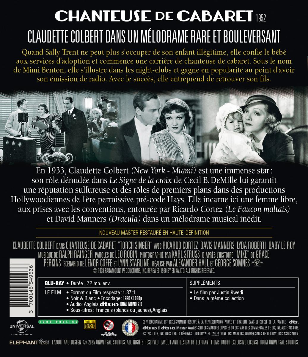 En 1933, Claudette Colbert (New York - Miami) est une immense star : son rôle dénudée dans Le Signe de la croix de Cecil B. Demille lui garantit une réputation sulfureuse et des rôles de premiers plans dans des productions Hollywoodiennes de l'ère permissive pré-code Hays. Elle incarne ici une femme libre, aux prises avec les conventions, entourée par Ricardo Cortez (Le Faucon maltais) et David Manners (Dracula) dans un mélodrame musical inédit.