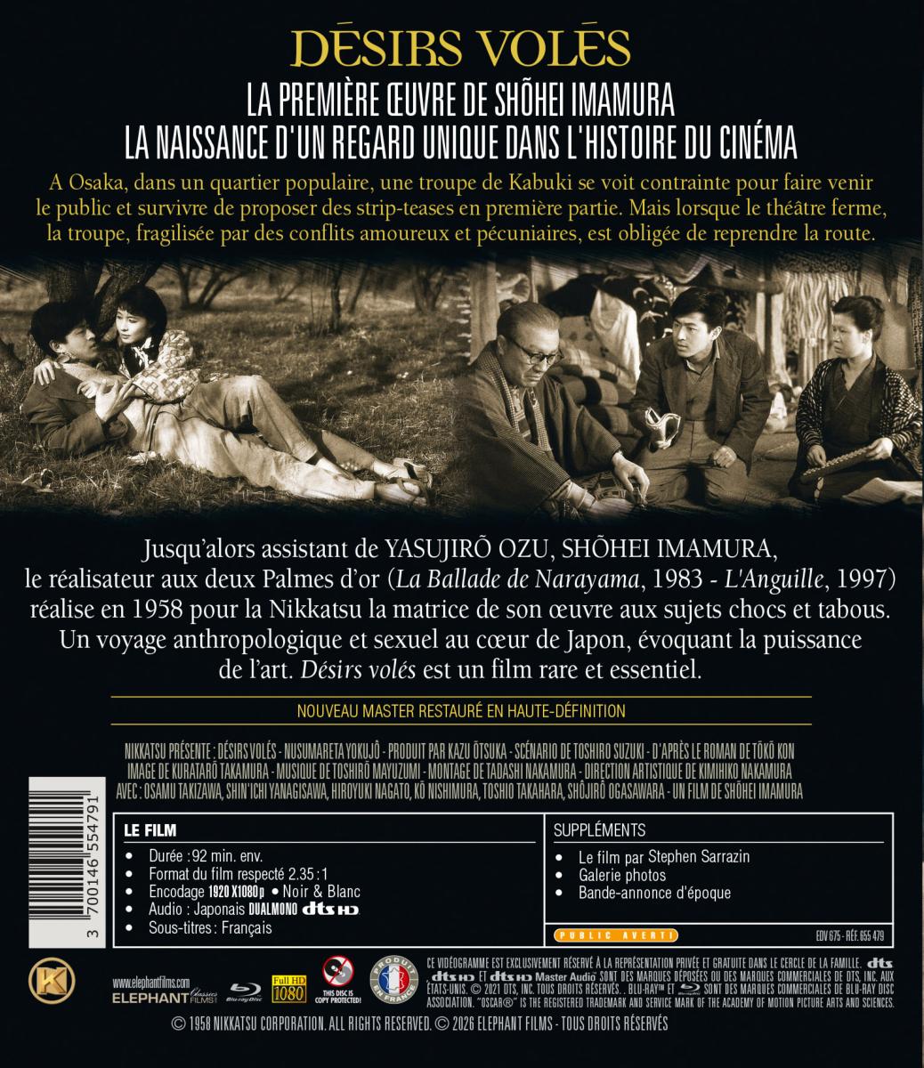 Titre : Désirs volés - Blu-ray single Titre original : ?????? (Nusumareta yokuj?) Date de sortie : 07/04/2026 Réalisateur(s) : Shôhei Imamura Acteurs : Hiroyuki Nagato, Kô Nishimura, Osamu Takizawa, Shin'ichi Yanagisawa, Shôjirô Ogasawara, Toshio Takahara Scénariste(s) : Tôkô Kon, Toshiro Suzuki Musique : Toshirô Mayuzumi Résumé : A Osaka, dans un quartier populaire, une troupe de Kabuki se voit contrainte, pour faire venir le public et survivre, de proposer des strip-teases en première partie. Mais lorsque le théâtre ferme, la troupe, fragilisée par des conflits amoureux et pécuniaires, est obligée de reprendre la route. Accroche : La première œuvre de Shohei Imamura : la naissance d'un regard unique dans l'histoire du cinéma. Jusqu’alors assistant de Yasujirõ Ozu, Shõhei Imamura, le réalisateur aux deux Palmes d’or (La Ballade de Narayama, 1983 - L'Anguille, 1997) réalise en 1958 pour la Nikkatsu la matrice de son oeuvre aux sujets chocs et tabous. Un voyage anthropologique et sexuel au cœur du Japon, évoquant la puissance de l’art. Désirs volés est un film rare et essentiel. Pays de production : Japon Année de production : 1958 Durée : 92 min. env. Format audio : Japonais - DTS HD Dual Mono 2.0 Classification : Public averti Copyright : © 1958 Nikkatsu Corporation. All Rights Reserved.