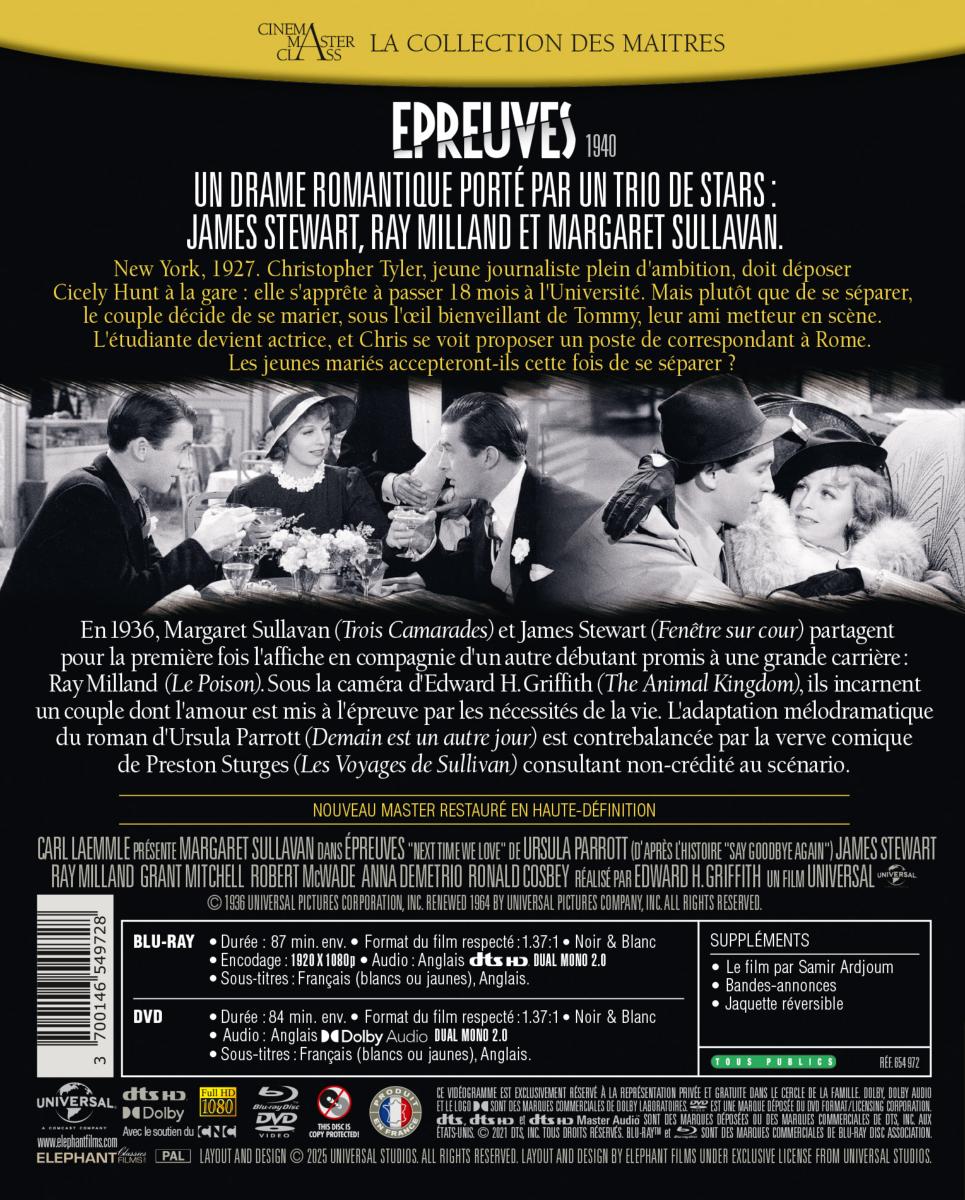 Titre : Épreuves - Combo Blu-ray + DVD Titre original : Next Time We Love Réalisateur(s) : Edward H. Griffith Acteurs : Margaret Sullavan, James Stewart, Ray Milland, Grant Mitchell Scénariste(s) : Ursula Parrott, Melville Baker, Preston Sturges, Doris Anderson, Rose Franken, Josephine Tey Musique : Franz Waxman Résumé : New York, 1927. Christopher Tyler, jeune journaliste plein d'ambition, doit déposer Cicely Hunt à la gare : elle s'apprête à passer 18 mois à l'Université. Mais plutôt que de se séparer, le couple décide de se marier, sous l'œil bienveillant de Tommy, leur ami metteur en scène. L'étudiante devient actrice, et Chris se voit proposer un poste de correspondant à Rome. Les jeunes mariés accepteront-ils cette fois de se séparer ? Accroche : Un drame romantique porté par un trio de star débutant : James Stewart, Ray Milland et Margaret Sullavan. En 1936, Margaret Sullavan (Trois Camarades) et James Stewart (Fenêtre sur cour) partagent pour la première fois l'affiche en compagnie d'un autre débutant promis à une grande carrière : Ray Milland (Le Poison). Sous la caméra d'Edward H. Griffith (The Animal Kingdom), ils incarnent un couple dont l'amour est mis à l'épreuve par les nécessités de la vie et les envies professionnelles. L'adaptation du roman mélodramatique d'Ursula Parrott (Demain est un autre jour) est contrebalancée par la verve comique de Preston Sturges (Les Voyages de Sullivan) consultant non-crédité au scénario. Pays de production : États-Unis Année de production : 1936 Durée : 87 min. env. Format audio : Anglais - DTS HD Dual Mono 2.0 Classification : Tous publics Copyright : © 1936 Universal Pictures Corporation. Renewed © 1963 Universal Studios. All Rights Reserved.