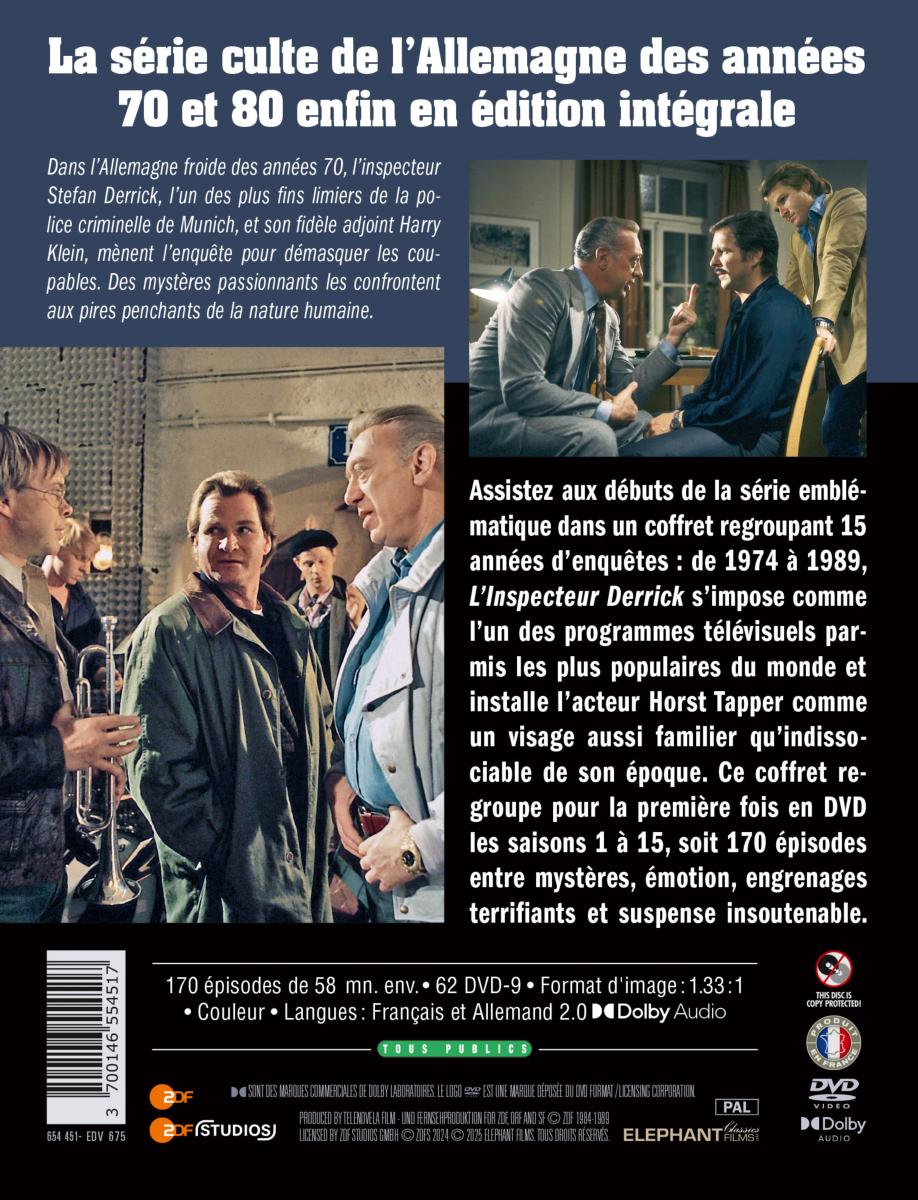 Titre : Inspecteur Derrick - Intégrale saison 1 à 15 - Coffret 62 DVD Titre original : Derrick Réalisateur(s) : Theodor Grädler, Helmuth Ashley, Alfred Weidenmann, Zbynek Brynych, Alfred Vohrer, Erik Ode, Dietrich Haugk, Günter Gräwert, Theodor Grädler, Helmuth Ashley, Alfred Vohrer, Zbynek Brynych, Alfred Weidenmann Acteurs : Horst Tappert, Fritz Wepper, Willy Schäfer Scénariste(s) : Herbert Reinecker Musique : Frank Duval, Les Humphries Résumé : Dans l'Allemagne froide des années 70, l'inspecteur Stefan Derrick, l'un des plus fins limiers de la police criminelle de Munich, et son fidèle adjoint Harry Klein, mènent l'enquête pour démasquer les coupables. Des mystères passionnants les confrontent aux pires penchants de la nature humaine. Accroche : La série culte de l'Allemagne des années 70 et 80 enfin en édition intégrale. Assistez aux débuts de la série emblématique dans un coffret regroupant 15 années d'enquêtes : de 1974 à 1988, L'Inspecteur Derrick s'impose comme l'un des programmes télévisuels parmis les plus populaires du monde et installe l'acteur Horst Tapper comme un visage aussi familier qu'indissociable de son époque. Ce coffret regroupe pour la première fois en DVD les saisons 1 à 15, soit 170 épisodes entre mystères, émotion, engrenages terrifiants et suspense insoutenable. Pays de production : Allemagne Année de production : 1973-1988 Durée : 9860 min. env. Format audio : Français, Allemand - Dolby Audio Dual Mono 2.0 Classification : Tous publics Copyright : Produced by Telenovela Film- und Fernsehproduktion for ZDF, ORF and SF © ZDF 1974-1988