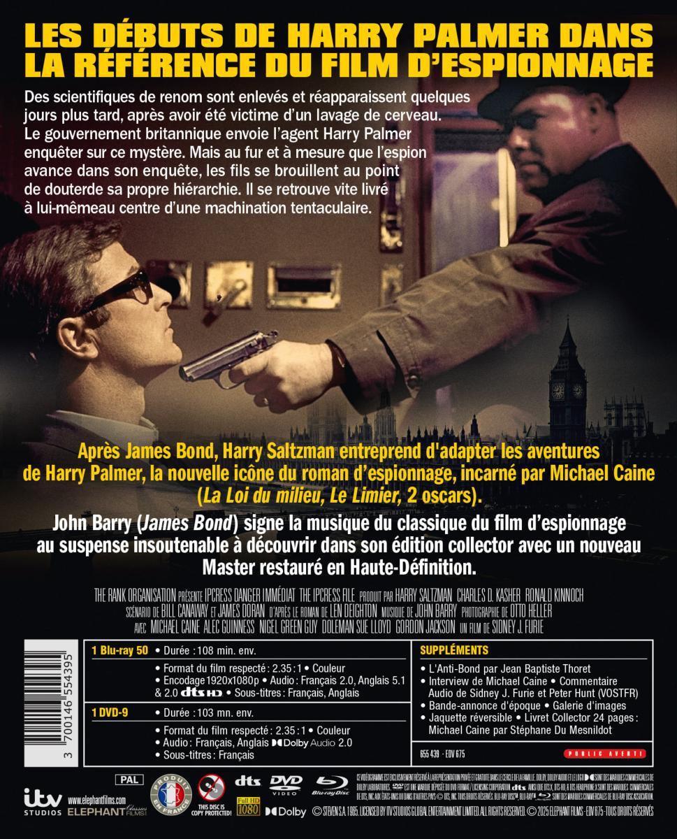Titre : Ipcress : Danger immédiat - Combo Blu-ray + DVD + Livret Titre original : The Ipcress File Réalisateur(s) : Sidney J. Furie Acteurs : Michael Caine, Nigel Green, Sue Lloyd, Aubrey Richards, Gordon Jackson, Guy Doleman Scénariste(s) : Len Deighton, W.H. Canaway, James Doran, Lionel Davidson, Johanna Harwood, Lukas Heller, Ken Hughes Musique : John Barry Résumé : Des scientifiques de renom sont enlevés et réapparaissent quelques jours plus tard, après avoir été victime d'un lavage de cerveau. Le gouvernement britannique envoie l'agent Harry Palmer enquêter sur ce mystère. Mais au fur et à mesure que l'espion avance dans son enquête, les fils se brouillent au point de douter de sa propre hiérarchie. Il se retrouve vite livré à lui-même au centre d'une machination tentaculaire. Accroche : Les débuts de Harry Palmer dans la référence du film d'espionnage. Après James Bond Harry Saltzman entreprend d'adapter les aventures de Harry Palmer, la nouvelle icône du roman d'espionnage, incarné par Michael Caine (La Loi du milieu, Le Limier - 2 Oscars).