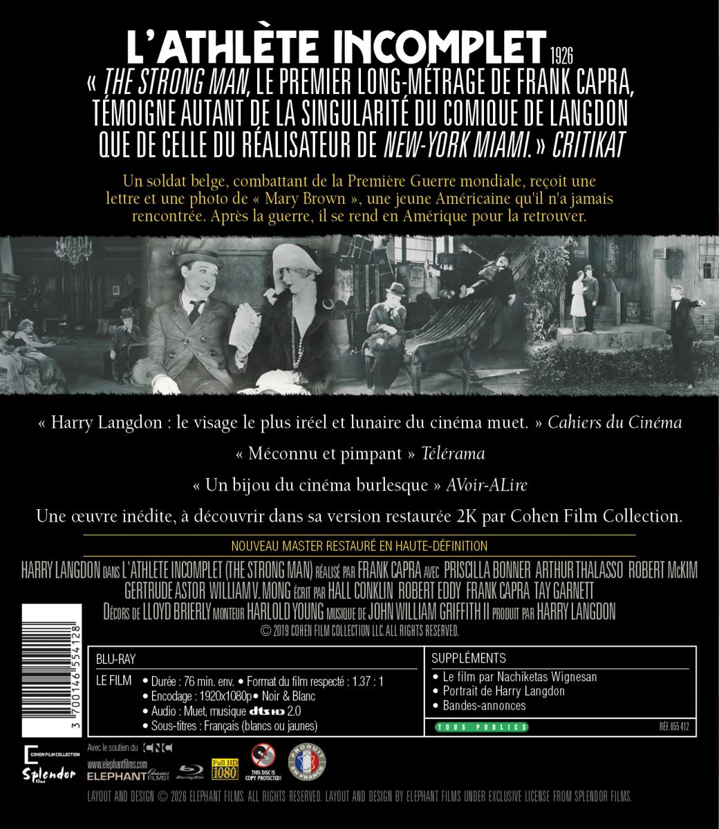 Titre : L'Athlète incomplet - The Strong Man - Blu-ray single Titre original : The Strong Man Date de sortie : 05/05/2026 Réalisateur(s) : Frank Capra Acteurs : Harry Langdon, Priscilla Bonner, Gertrude Astor, William V. Mong, Robert McKim, Arthur Thalasso Scénariste(s) : Frank Capra, Arthur Ripley, Hal Conklin, Robert Eddy, Reed Heustis, Clarence Hennecke, James Langdon, Tim Whelan, Tay Garnett Musique : John William Griffith II Résumé : Un soldat belge, combattant de la Première Guerre mondiale, reçoit une lettre et une photo de "Mary Brown", une jeune Américaine qu'il n'a jamais rencontrée. Après la guerre, il se rend en Amérique pour la retrouver. Accroche : «The Strong Man, le premier long-métrage de Frank Capra, témoigne autant de la singularité du comique de Langdon que de celle, encore naissante, du réalisateur de New-York Miami. » Critikat « Harry Langdon : le visage le plus iréel et lunaire du cinéma muet. » Cahiers du Cinéma « Méconnu et pimpant » Télérama « Un bijou du cinéma burlesque » AVoir-ALire