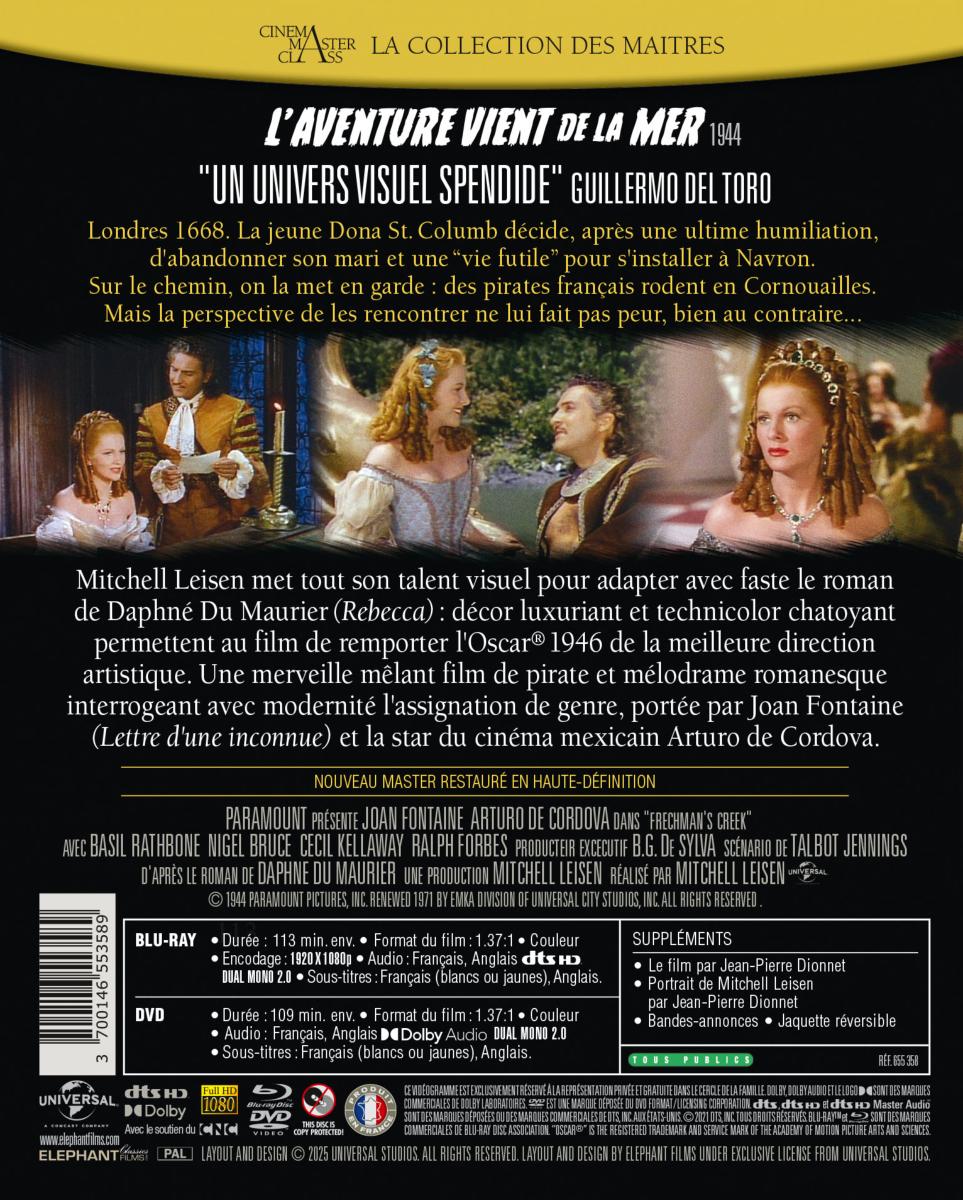 Titre : L'Aventure vient de la mer - Combo Blu-ray + DVD Titre original : Frenchman's Creek Date de sortie : 03/03/2026 Réalisateur(s) : Mitchell Leisen Acteurs : Joan Fontaine, Arturo de Córdova, Basil Rathbone, Nigel Bruce, Cecil Kellaway, Ralph Forbes, Harald Maresch Scénariste(s) : Daphne Du Maurier, Talbot Jennings, Claude Debussy Musique : Victor Young Résumé : Londres 1668. La jeune Dona St. Columb décide, après une ultime humiliation, d'abandonner son mari et une "vie futile" pour s'installer à Navron. Sur le chemin, on la met en garde : des pirates français rodent en Cornouailles. Mais la perspective de les rencontrer ne lui fait pas peur, bien au contraire... Accroche : "Un univers visuel spendide" Guillermo del Toro Mitchell Leisen met tout son talent visuel pour adapter avec faste le roman de Daphne Du Maurier (Rebecca) : décor luxuriant et technicolor chatoyant permettent au film de remporter l'Oscar 1946 de la meilleure direction artistique. Une merveille mêlant film de pirate et mélodrame romanesque interrogeant avec modernité l'assignation de genre, portée par Joan Fontaine (Lettre d'une inconnue) et la star du cinéma mexicain Arturo de Cordova. Pays de production : États-Unis Année de production : 1944 Durée : 113 min. env. Format audio : Français, Anglais - DTS HD Dual Mono 2.0 Classification : Tous publics Copyright : © 1944 Paramount Pictures, Inc. Renewed 1971 by EMKA Division of Universal City Studios, Inc. All Rights Reserved.