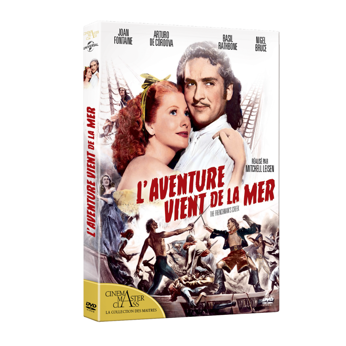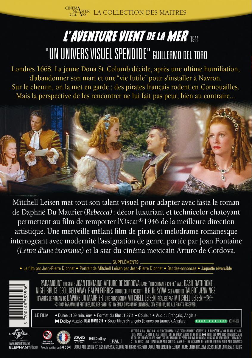 Titre : L'Aventure vient de la mer - DVD Titre original : Frenchman's Creek Date de sortie : 03/03/2026 Réalisateur(s) : Mitchell Leisen Acteurs : Joan Fontaine, Arturo de Córdova, Basil Rathbone, Nigel Bruce, Cecil Kellaway, Ralph Forbes, Harald Maresch Scénariste(s) : Daphne Du Maurier, Talbot Jennings, Claude Debussy Musique : Victor Young Résumé : Londres 1668. La jeune Dona St. Columb décide, après une ultime humiliation, d'abandonner son mari et une "vie futile" pour s'installer à Navron. Sur le chemin, on la met en garde : des pirates français rodent en Cornouailles. Mais la perspective de les rencontrer ne lui fait pas peur, bien au contraire... Accroche : "Un univers visuel spendide" Guillermo del Toro Mitchell Leisen met tout son talent visuel pour adapter avec faste le roman de Daphne Du Maurier (Rebecca) : décor luxuriant et technicolor chatoyant permettent au film de remporter l'Oscar 1946 de la meilleure direction artistique. Une merveille mêlant film de pirate et mélodrame romanesque interrogeant avec modernité l'assignation de genre, portée par Joan Fontaine (Lettre d'une inconnue) et la star du cinéma mexicain Arturo de Cordova. Pays de production : États-Unis Année de production : 1944 Durée : 109 min. env. Format audio : Français, Anglais - Dolby Audio Dual Mono 2.0 Classification : Tous publics Copyright : © 1944 Paramount Pictures, Inc. Renewed 1971 by EMKA Division of Universal City Studios, Inc. All Rights Reserved.