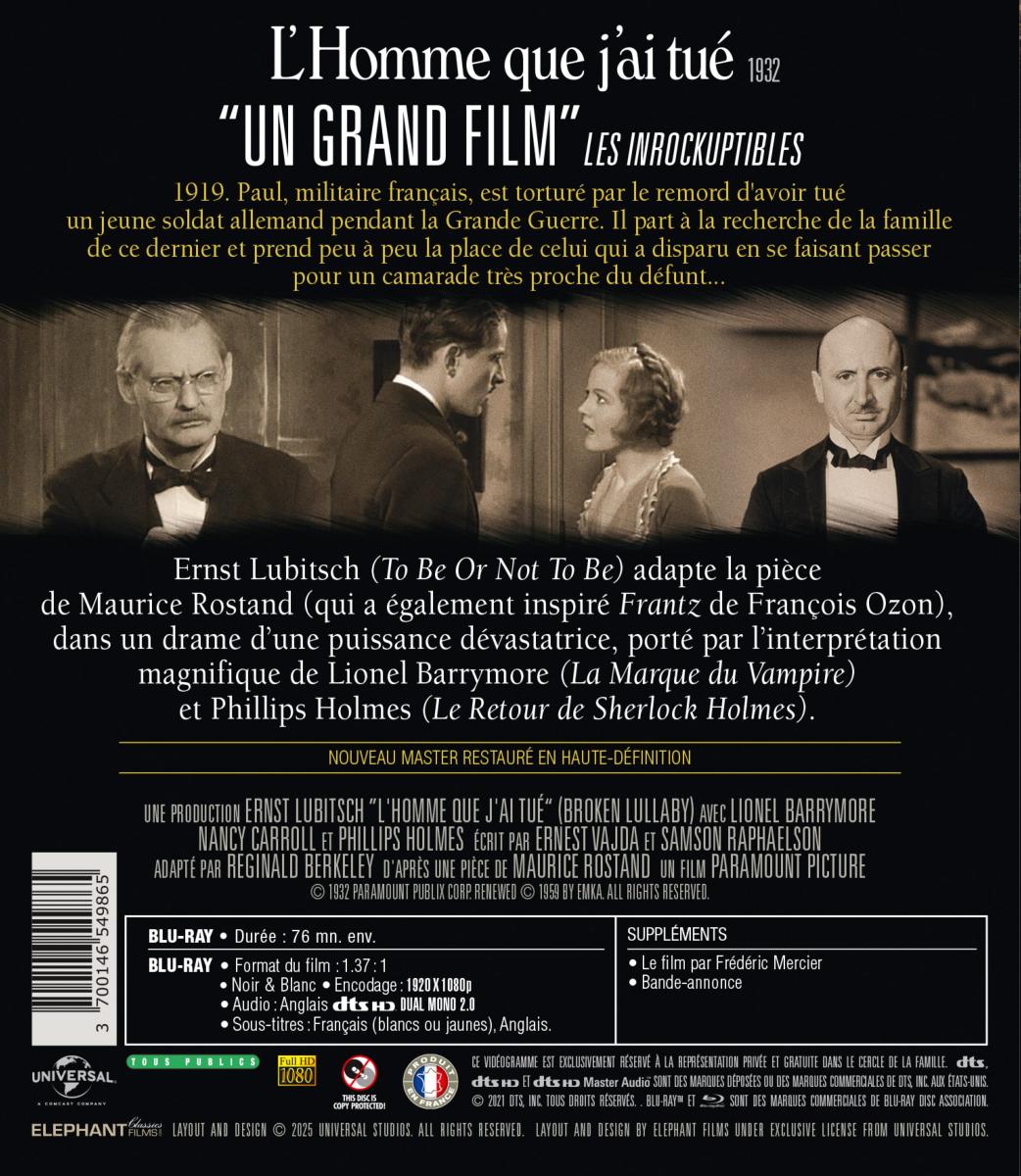 Titre : L'Homme que j'ai tué - Blu-ray single Titre original : Broken Lullaby Date de sortie : 13/01/2026 Réalisateur(s) : Ernst Lubitsch Acteurs : Lionel Barrymore, Louise Carter, Nancy Carroll, Phillips Holmes Scénariste(s) : Maurice Rostand, Reginald Berkeley, Samson Raphaelson, Ernest Vajda Musique : W. Franke Harling Résumé : 1919. Paul, militaire français, est torturé par le remord d'avoir tué un jeune soldat allemand pendant la Grande Guerre. Il part à la recherche de la famille de ce dernier et prend peu à peu la place de celui qui a disparu en se faisant passer pour un camarade très proche du défunt... Accroche : "Un grand film" Les Inrockuptibles Ernst Lubitsch (To Be Or Not To Be) adapte la pièce de Maurice Rostand (qui a également inspiré Frantz de François Ozon), dans un drame d’une puissance dévastatrice, porté par l’interprétation magnifique de Lionel Barrymore (La Marque du Vampire), Nancy Carroll (Le Baiser devant le miroir) et Phillips Holmes (Le Retour de Sherlock Holmes). Pays de production : États-Unis Année de production : 1932 Durée : 77 min. env. Format audio : Anglais - DTS HD Dual Mono 2.0 Classification : Tous publics Copyright : © 1932 Paramount Publix Corp. Renewed 1959 by Emka. All Rights Reserved.