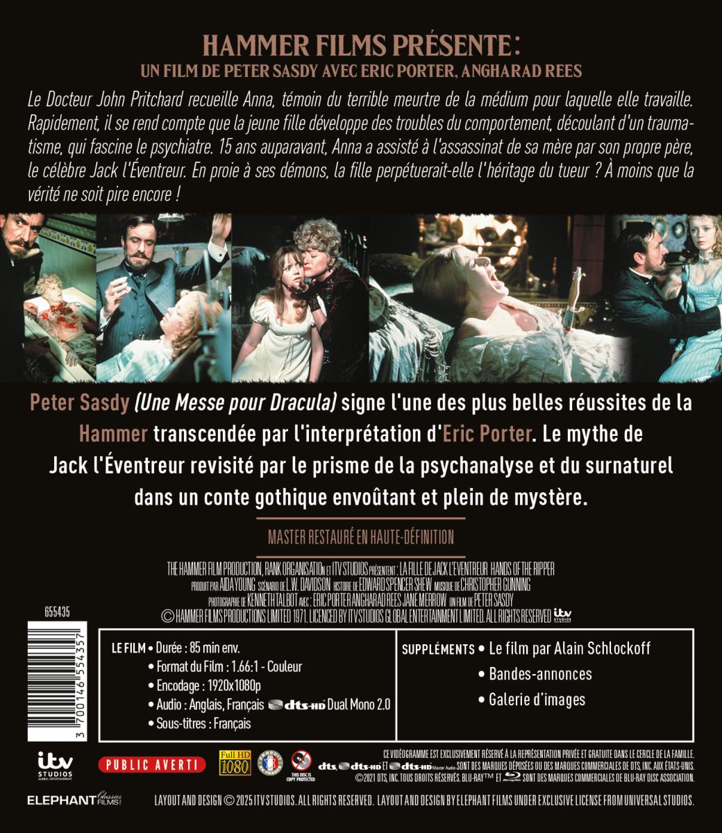 Titre : La Fille De Jack L'Eventreur - Blu-ray single Titre original : Hands of the ripper Date de sortie : 10/02/2026 Réalisateur(s) : Peter Sasdy Acteurs : Eric Porter, Angharad Rees, Derek Godfrey, Dora Bryan, Jane Merrow, Keith Bell, Marjorie Rhodes Scénariste(s) : Lewis Davidson, Edward Spencer Shew Musique : Christopher Gunning Résumé : Le Docteur John Pritchard recueille Anna, témoin du terrible meurtre de la médium pour laquelle elle travaille. Rapidement, il se rend compte que la jeune fille développe des troubles du comportement, découlant d'un traumatisme, qui fascine le psychiatre. 15 ans auparavant, Anna a assisté à l'assassinat de sa mère par son propre père, le célèbre Jack l'É ventreur. En proie à ses démons, la fille perpétuerait-elle l'héritage du tueur ? A moins que la vérité ne soit pire encore ! Accroche : HAMMER FILMS présente : un film de PETER SASDY avec ERIC PORTER, ANGHARAD REES Peter Sasdy (Une Messe pour Dracula) signe l'une des plus belles réussites de la Hammer transcendée par l'interprétation d'Eric Porter. Le mythe de Jack l'Éventreur revisité par le prisme de la psychanalyse et du surnaturel dans un conte gothique envoûtant et plein de mystère. Pays de production : Royaume-Uni Année de production : 1971 Durée : 85 min. env. Format audio : Français, Anglais - DTS HD Dual Mono 2.0 Classification : Public averti Copyright : © Hammer Films Productions Limited 1971. Licenced By ITV Studios Global Entertainment Limited. All Rights Reserved.