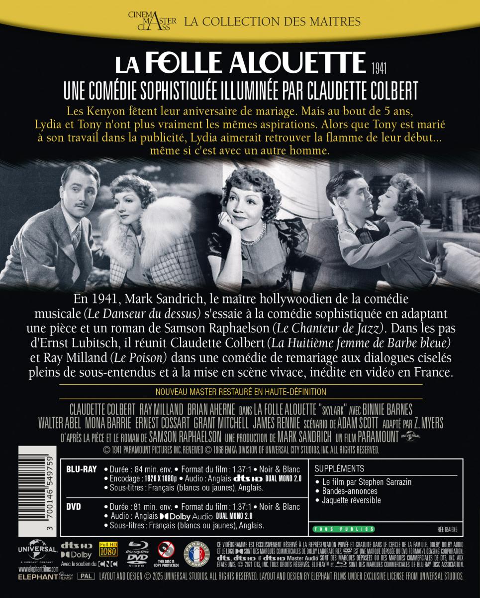 Titre : La Folle Alouette - Combo Blu-ray + DVD Titre original : Skylark Réalisateur(s) : Mark Sandrich Acteurs : Claudette Colbert, Ray Milland, Brian Aherne, Binnie Barnes, Walter Abel Scénariste(s) : Samson Raphaelson, Allan Scott, Zion Myers Musique : Victor Young Résumé : Les Kenyon fêtent leur aniversaire de mariage. Mais au bout de 5 ans, Lydia et Tony n'ont plus vraiment les mêmes aspirations. Alors que Tony est marié à son travail dans la publicité, Lydia aimerait retrouver la flamme de leur début… même si c'est avec un autre homme. Accroche : Une comédie sophistiquée illuminée par Claudette Colbert. En 1941, Mark Sandrich, le maître hollywoodien de la comédie musicale (Le Danseur du dessus) s'essaie à la comédie sophistiquée en adaptant une pièce et un roman de Samson Raphaelson (Le Chanteur de Jazz). Dans les pas d'Ernst Lubitsch, il réunit Claudette Colbert (La Huitième femme de Barbe bleu) et Ray Milland (Le Poison) dans une comédie de remariage aux dialogues ciselés pleins de sous-entendus et à la mise en scène vivace, inédite en vidéo en France. Pays de production : États-Unis Année de production : 1941 Durée : 84 min. env. Format audio : Anglais - DTS HD Dual Mono 2.0 Classification : Tous publics Copyright : © 1941 Paramount Pictures Inc. Renewed © 1968 Emka Division of Universal City Studios, Inc. All Rights Reserved.