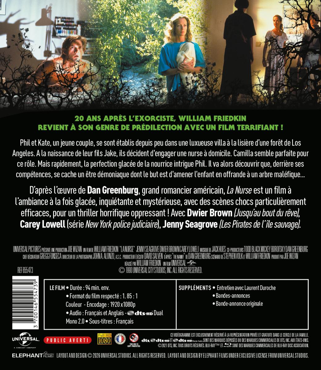 Titre : La Nurse - Blu-ray single Titre original : The Guardian Date de sortie : 10/02/2026 Réalisateur(s) : William Friedkin Acteurs : Jenny Seagrove, Dwier Brown, Carey Lowell, Brad Hall, Miguel Ferrer, Natalia Nogulich, Pamela Brull Scénariste(s) : Dan Greenburg, Stephen Volk, William Friedkin Musique : Jack Hues Résumé : Phil et Kate, un jeune couple, se sont établis depuis peu dans une luxueuse villa à la lisière d’une forêt de Los Angeles. A la naissance de leur fils Jake, ils décident d'engager une nurse à domicile. Camilla semble parfaite pour ce rôle. Mais rapidement, la perfection glacée de la nourrice intrigue Phil. Il va alors découvrir que, derrière ses compétences, se cache un être démoniaque dont le but est d'amener l'enfant en offrande à un arbre maléfique... Accroche : 20 ANS APRÈS L’EXORCISTE, WILLIAM FRIEDKIN REVIENT À SON GENRE DE PRÉDILECTION AVEC UN FILM TERRIFIANT ! D’après l'œuvre de Dan Greenburg, grand romancier américain, La Nurse est un film à l’ambiance à la fois glacée, inquiétante et mystérieuse, avec des scènes chocs particulièrement efficaces, pour un thriller horrifique oppressant ! Avec Dwier Brown (Jusqu’au bout du rêve), Carey Lowell (New York police judiciaire), Jenny Seagrove (Les Pirates de l’île sauvage). Pays de production : États-Unis Année de production : 1990 Durée : 94 min. env. Format audio : Français, Anglais - DTS HD 2.0 Classification : Public averti Copyright : © 1990 Universal City Studios, Inc. All Rights Reserved.