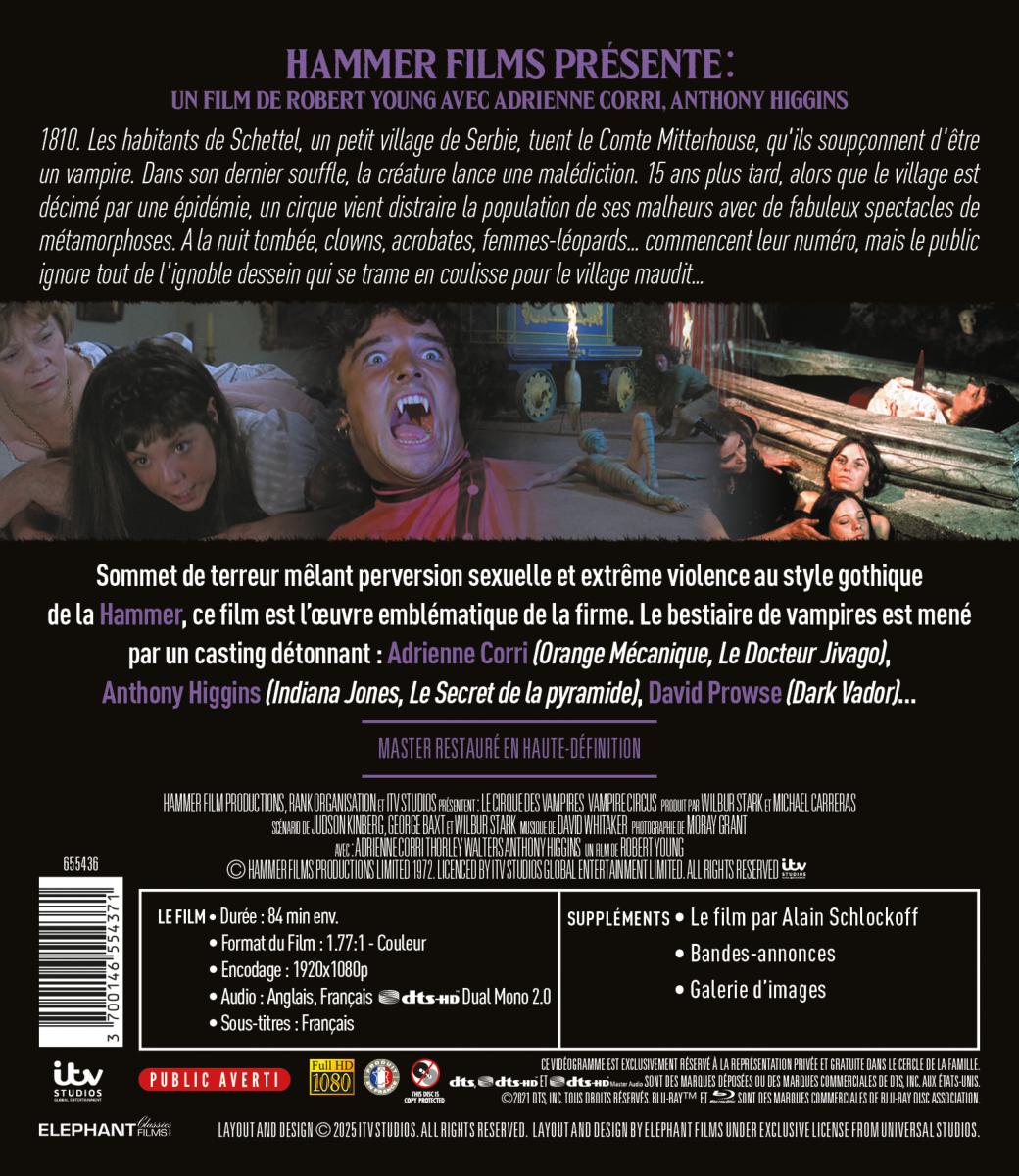 Titre : Le Cirque Des Vampires - Blu-ray single Titre original : Vampire Circus Date de sortie : 10/06/2026 Réalisateur(s) : Robert Young Acteurs : Adrienne Corri, Antohny Higgins, David Prowse, John Moulder-Brown, Laurence Payne, Thorley Walters Scénariste(s) : Jud Kinberg, George Baxt, Wilbur Stark Musique : David Whitaker Résumé : 1810. Les habitants de Schettel, un petit village de Serbie, tuent le Comte Mitterhouse, qu'ils soupçonnent d'être un vampire. Dans son dernier souffle, la créature lance une malédiction. 15 ans plus tard, alors que le village est décimé par une épidémie, un cirque vient distraire la population de ses malheurs avec de fabuleux spectacles de métamorphoses. A la nuit tombée, clowns, acrobates, femmes-léopards... commencent leur numéro, mais le public ignore tout de l'ignoble dessein qui se trame en coulisse pour le village maudit... Accroche : HAMMER FILMS présente : un film de ROBERT YOUNG avec ADRIENNE CORRI, ANTHONY HIGGINS, DAVID PROWSE Sommet de terreur mêlant perversion sexuelle et extrême violence au style gothique de la Hammer, ce film est une œuvre emblématique de la dernière période de la firme. Le bestiaire de vampire est mené par un casting détonnant : Adrienne Corri (Orange Mécanique, Le Docteur Jivago), Anthony Higgins (Indiana Jones, Le Secret de la pyramide), David Prowse (Dark Vador)... Pays de production : Royaume-Uni Année de production : 1972 Durée : 84 min. env. Format audio : Français, Anglais - DTS HD Dual Mono 2.0 Classification : Public averti Copyright : © Hammer Films Productions Limited 1972. Licenced By ITV Studios Global Entertainment Limited. All Rights Reserved.