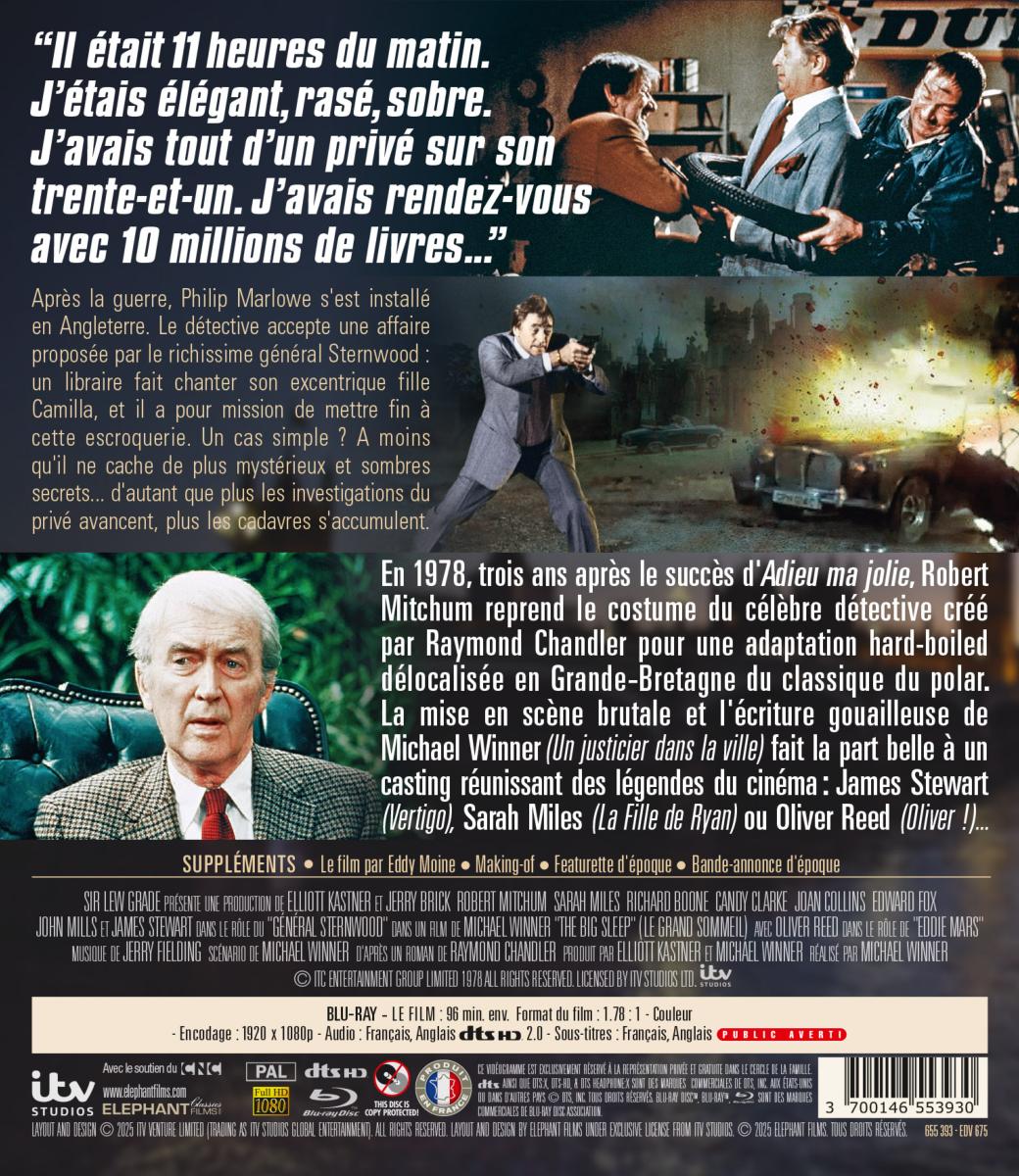 En 1978, trois ans après le succès d'Adieu ma jolie, Robert Mitchum reprend le costume du célèbre détective créé par Raymond Chandler pour une adaptation hard-boiled délocalisée en Grande-Bretagne du classique du polar. La mise en scène brutale et l'écriture gouailleuse de Michael Winner (Un justicier dans la ville) fait la part belle à un casting réunissant des légendes du cinéma : James Stewart (Vertigo), Sarah Miles (La Fille de Ryan) ou Oliver Reed (Oliver !)... Pays de production : Royaume-Uni, États-Unis Année de production : 1978 Durée : 99 min. env. Format audio : Français, Anglais - DTS HD 2.0 Classification : Public averti Copyright : © ITC Entertainment Group Limited 1978 All Rights Reserved. Licensed by ITV Studios Ltd.