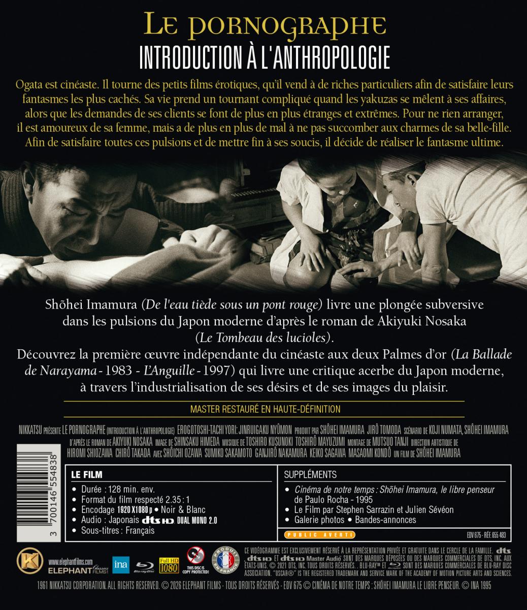 Titre : Le Pornographe - Blu-ray single Titre original : ???????? ????? (Erogotoshi-tachi yori: Jinruigaku nyûmon) Date de sortie : 07/04/2026 Réalisateur(s) : Shôhei Imamura Acteurs : Shôichi Ozawa, Sumiko Sakamoto, Keiko Sagawa, Chôchô Miyako, Ganjirô Nakamura, Haruo Tanaka Scénariste(s) : Akiyuki Nosaka, Shôhei Imamura, Koji Numata Musique : Toshiro Kusunoki, Toshirô Mayuzumi Résumé : Ogata est cinéaste. Il tourne des petits films érotiques, qu'il vend à de riches particuliers afin de satisfaire leurs fantasmes les plus cachés. Sa vie prend un tournant compliqué quand les yakuzas se mêlent à ses affaires, alors que les demandes de ses clients se font de plus en plus étranges et extrêmes. Pour ne rien arranger, il est amoureux de sa femme, mais a de plus en plus de mal à ne pas succomber aux charmes de sa belle-fille. Afin de satisfaire toutes ces pulsions et de mettre fin à ses soucis, il décide de réaliser le fantasme japonais ultime. Accroche : Introduction à l'anthropologie Sh?hei Imamura (De l'eau tiède sous un pont rouge) livre une plongée subversive dans les pulsions du Japon moderne d’après le roman de Akiyuki Nosaka (Le Tombeau des lucioles). Découvrez la première œuvre indépendante du cinéaste aux deux Palmes d’or (La Ballade de Narayama – 1983 - L’Anguille – 1997) qui livre une critique acerbe du Japon moderne, à travers l’industrialisation de ses désirs et de ses images du plaisir.