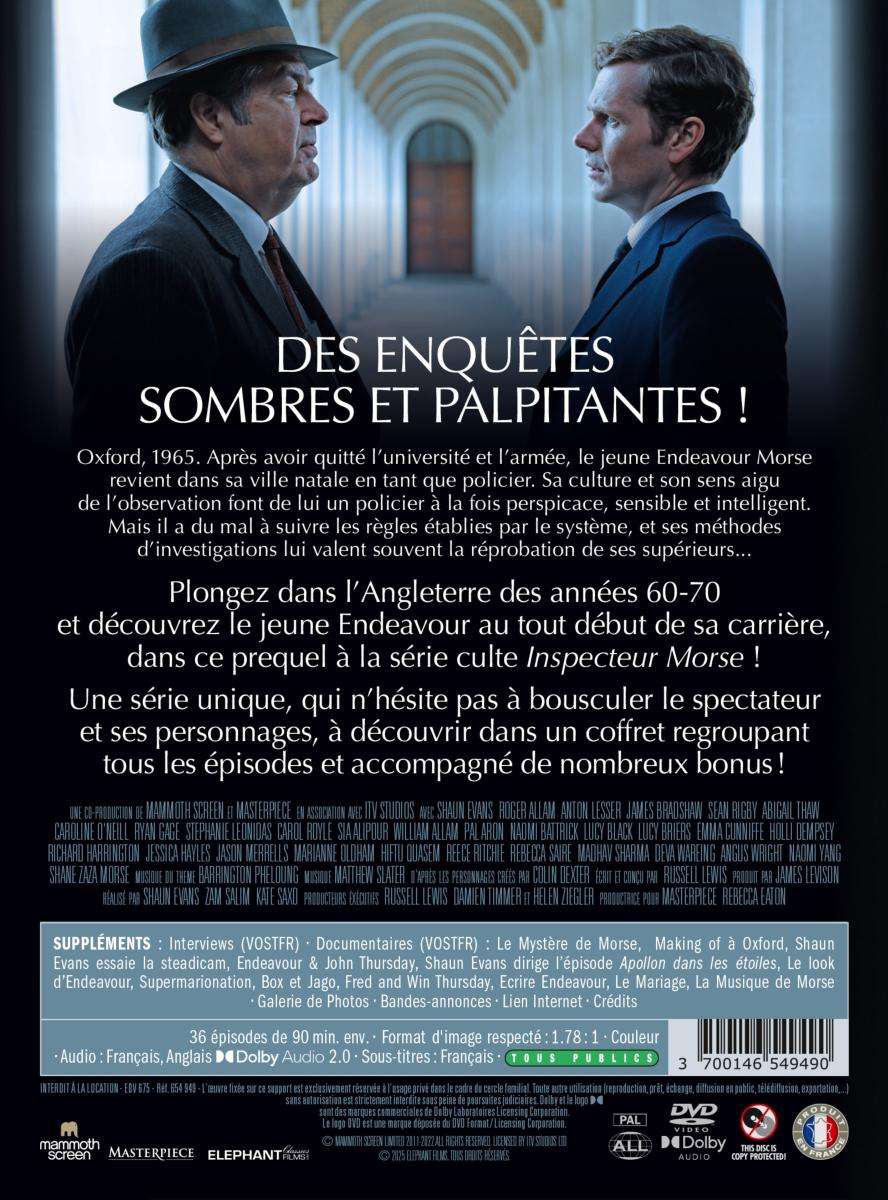 Date de sortie : 18/11/2025 Nombres d'épisodes : 36 Épisodes : Format d'image : 1.78 : 1 Couleur Sous-titres : Français Nombre de disque : 36 EAN : 3700146549490 Suppléments : Interviews (VOSTFR) - Documentaires (VOSTFR) : Le Mystère de Morse, Making of à Oxford, Shaun Evans essaie la steadicam, Endeavour & John Thursday, Shaun Evans dirige l'épisode Apollon dans les étoiles, Le look d’Endeavour, Supermarionation, Box et Jago, Fred and Win Thursday, Ecrire Endeavour, Le Mariage, La Musique de Morse - Galerie de Photos - Bandes-annonces - Lien Internet - Crédits Contenu : 36 DVD dans un coffret sous étui
