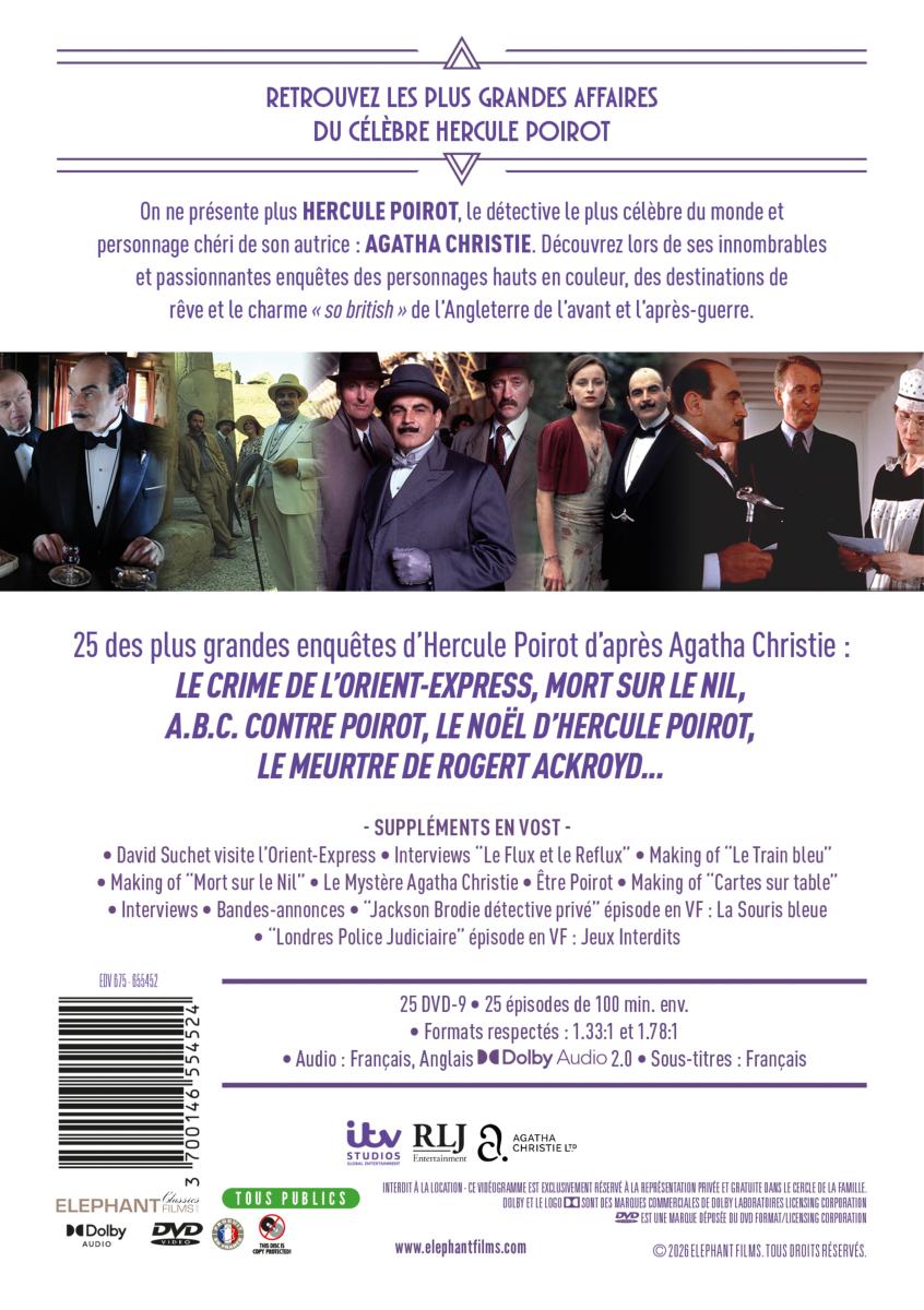 25 des plus grandes enquêtes d’Hercule Poirot d’après Agatha Christie (Le Crime de l’Orient-Express…) Des versions entièrement remasterisées, jamais les aventures du célèbre détective n’avaient été aussi belles ! L’immense David Suchet, la plus célèbre incarnation du détective fait étalage de tout son flegme et son talent. Du suspense, des mystères, de l’humour, préparez-vous pour des voyages inoubliables Pays de production : Royaume-Uni Année de production : 1989-2013 Durée : 2250 min. env. Format audio : Français, Anglais - Dolby Audio 2.0 Classification : Tous publics Copyright : © Shaftesbury Murdoch X Inc 2025. All rights reserved. Licensed by ITV Studios Global Entertainment.