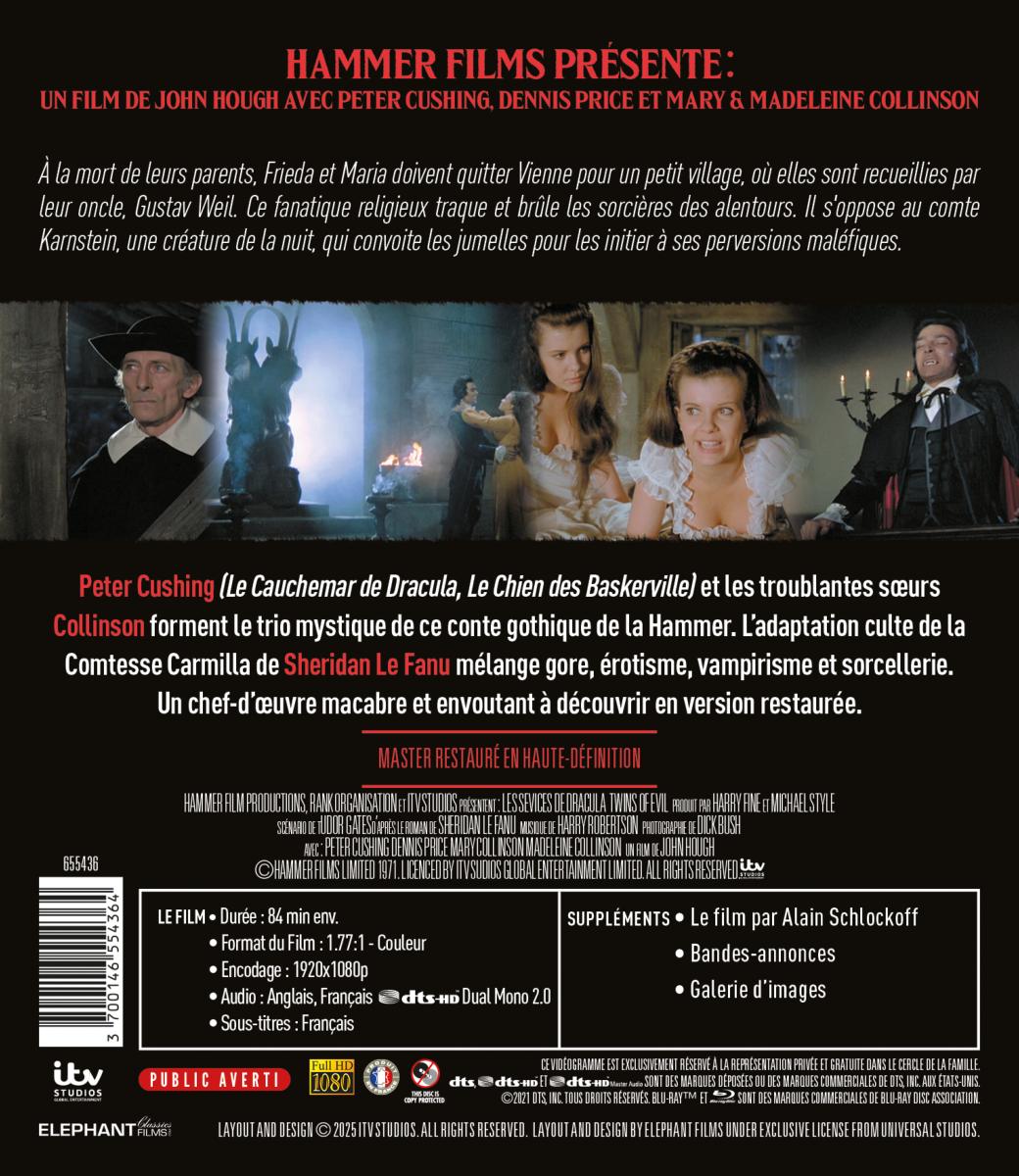 Titre : Les Sévices de Dracula - Blu-ray single Titre original : Twins of Evil Date de sortie : 10/02/2026 Réalisateur(s) : John Hough Acteurs : Peter Cushing, Dennis Price, Mary Collinson, Madeleine Collinson Scénariste(s) : Sheridan Le Fanu, Tudor Gates Musique : Harry Robertson Résumé : À la mort de leurs parents, Frieda et Maria doivent quitter Vienne pour un petit village, où elles sont recueillies par leur oncle, Gustav Weil. Ce fanatique religieux traque et brûle les sorcières des alentours. Il s'oppose au comte Karnstein, une créature de la nuit, qui convoite les jumelles pour les initier à ses perversions maléfiques. Accroche : HAMMER FILMS présente : un film de JOHN HOUGH avec PETER CUSHING, DENNIS PRICE et MARY & MADELEINE COLLINSON Peter Cushing (Le Cauchemar de Dracula, Le Chien des Baskerville) et les troublantes sœurs Collinson forment le trio mystique de ce conte gothique de la Hammer. L'adaptation culte de la Comtesse Carmilla de Sheridan Le Fanu mélange gore, érotisme, vampirisme et sorcellerie. Un chef-d'œuvre macabre et envoûtant à découvrir en version restaurée Haute-Définition. Pays de production : Royaume-Uni Année de production : 1971 Durée : 84 min. env. Format audio : Français, Anglais - DTS HD Dual Mono 2.0 Classification : Public averti Copyright : © Hammer Films Limited 1971. Licenced By ITV Sudios Global Entertainment Limited. All Rights Reserved.