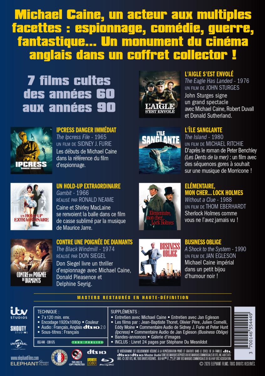 CONTIENT :Ipcress danger immédiat (The Ipcress File) - 1965 : Les débuts de Michael Caine dans la référence du film d'espionnage.Un hold-up extraordinaire (Gambit) - 1966 : Caine et Shirley MacLaine se renvoient la balle dans ce film de casse sublimé par la musique de Maurice Jarre.Contre une poignée de diamants (The Black Windmill) - 1974 : Don Siegel livre un thriller d'espionnage avec Michael Caine, Donald Pleasence et Delphine Seyrig.L'Aigle s'est envolé (The Eagle Has Landed) - 1976 : John Sturges signe un grand spectacle avec Michael Caine, Robert Duvall et Donald Sutherland.L'Île sanglante (The Island) - 1980 : D'après le roman de Peter Benchley (Les Dents de la mer) : un film avec des séquences gores à souhait sur une musique de Morricone !Elémentaire, mon cher... Lock Holmes (Without a Clue) - 1988 : Le plus grand détective du monde n’est pas celui que vous croyez : Sherlock Holmes comme vous ne l’avez jamais vu !Business oblige (A Shock to the System) - 1990 : Michael Caine impérial dans un petit bijou d'humour noir !