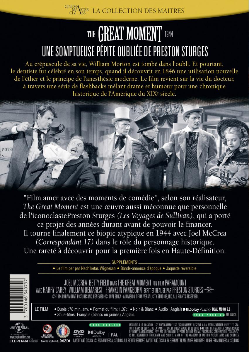 Titre : The Great Moment - DVD Titre original : The Great Moment Réalisateur(s) : Preston Sturges Acteurs : Joel McCrea, Betty Field, Harry Carey, William Demarest Scénariste(s) : René Fülöp-Miller, Preston Sturges, Charles Brackett, Ernst Laemmle, W.L. River, Irwin Shaw, Waldo Twitchell Musique : Victor Young Résumé : Au crépuscule de sa vie, William Morton est tombé dans l'oubli. Et pourtant, le dentiste fut célébré en son temps, quand il découvrit en 1846 une utilisation nouvelle de l'éther et le principe de l'anesthésie moderne. Le film revient sur la vie du docteur, à travers une série de flashbacks mêlant drame et humour pour une chronique historique de l'Amérique du XIXe siècle. Accroche : Une somptieuse pépite oubliée de Preston Sturges. "Film amer avec des moments de comédie", selon son réalisateur, The Great Moment est une œuvre aussi méconnue que personnelle de l'iconoclaste Preston Sturges (Les Voyages de Sullivan), qui a porté ce projet des années durant avant de pouvoir le financer. Il tourne finalement ce biopic atypique en 1944 avec Joel McCrea (Correspondant 17) dans le rôle du personnage historique. Une rareté à découvrir pour la première fois en Haute-Définition. Pays de production : États-Unis Année de production : 1944 Durée : 78 min. env. Format audio : Anglais - Dolby Audio Dual Mono 2.0 Classification : Tous publics Copyright : © 1944 Paramount Pictures Inc. Renewed © 1971 Emka - A Division of Universal City Studios, Inc. All Rights Reserved.